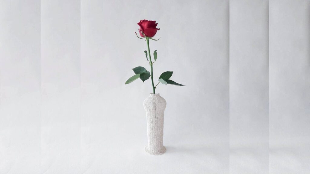 ――奈々ちゃんすごいわ!哲学する結び職人。もう達観してるね。まだまだ生き生きとしている奈々さん。そう、イキイキと言えば、お花を活ける「花器」も素敵な作品の一つ。あれはペットボトルを中に入れられるカバーのようなものなんですよね。花を活ける水と水引って両極端のものが融合していて、危うい「美」を感じるすごく色っぽい作品だと思いました。