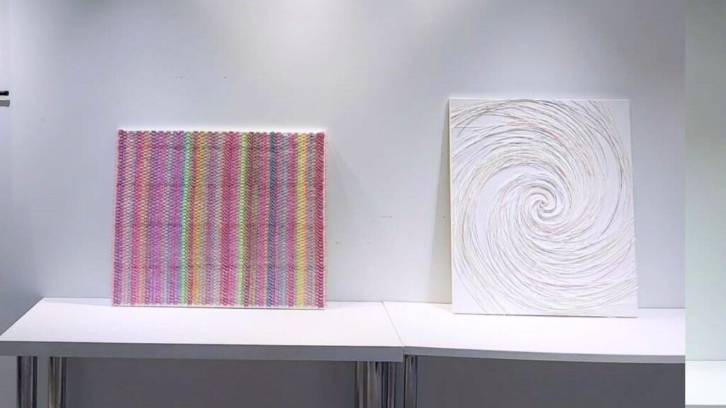 奈々:二つで対の作品だったんだけど、一つは20号の全面に結んだ「フラクタル」というタイトルのものでピンクの作品。もう一つは水引を結ぶ前の状態、紐の状態も美しく見せたいっていうのがあって、水引を渦巻状に貼り付けた「混沌」という作品になりました。水が排水溝を流れる時に渦ができるでしょ、そういうイメージ。