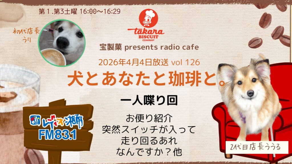 宝製菓presents radio café『犬とあなたと珈琲と。』FM83.1MHz レディオ湘南(第1.第3土曜 16:00~16:29)放送